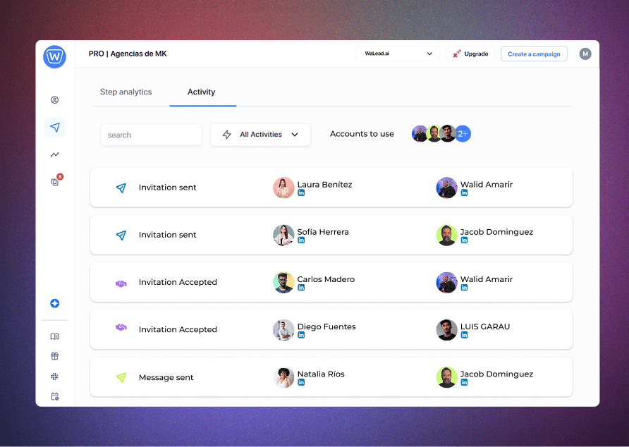 Multi-account sequence campaigns in WaLead allow businesses to engage with their leads automatically and continuously over time, guiding them through each stage of the sales funnel. Thanks to the LinkedIn account multirotation feature, you can set up a series of targeted messages that are sent automatically from different accounts, ensuring consistent and personalized follow-up. With this strategy, businesses can: