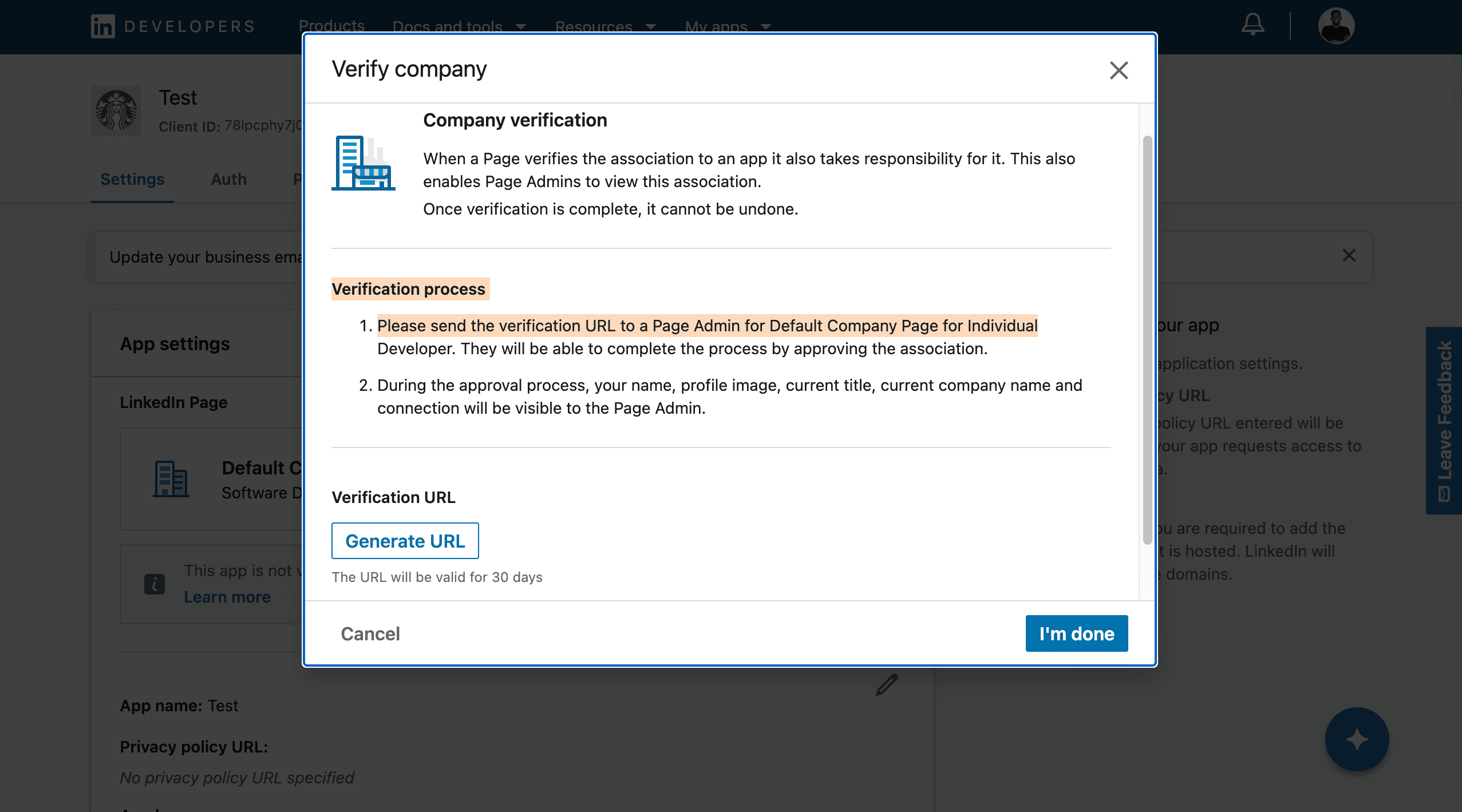 Se mostrará un cuadro de diálogo que te pedirá generar una URL de verificación. Genérala y abre el enlace en tu navegador para verificar la página.