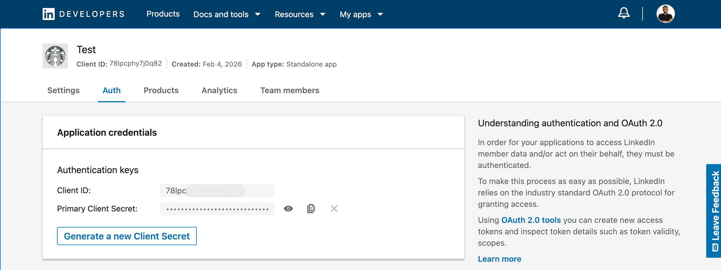 Después de crear la aplicación correctamente, se generarán un a client ID y un primary client secret que se utilizarán para la autenticación y autorización de tu aplicación. Cópialos y guárdalos para utilizarlos más adelante.