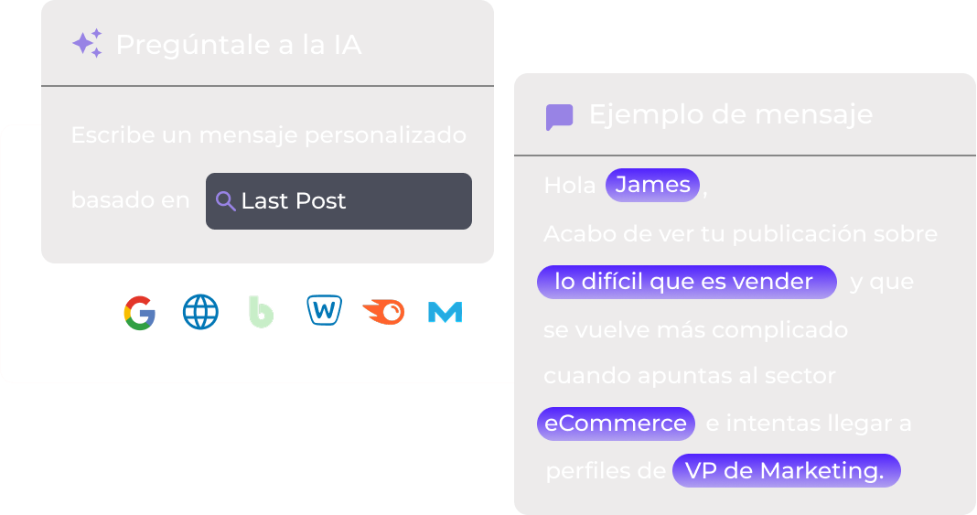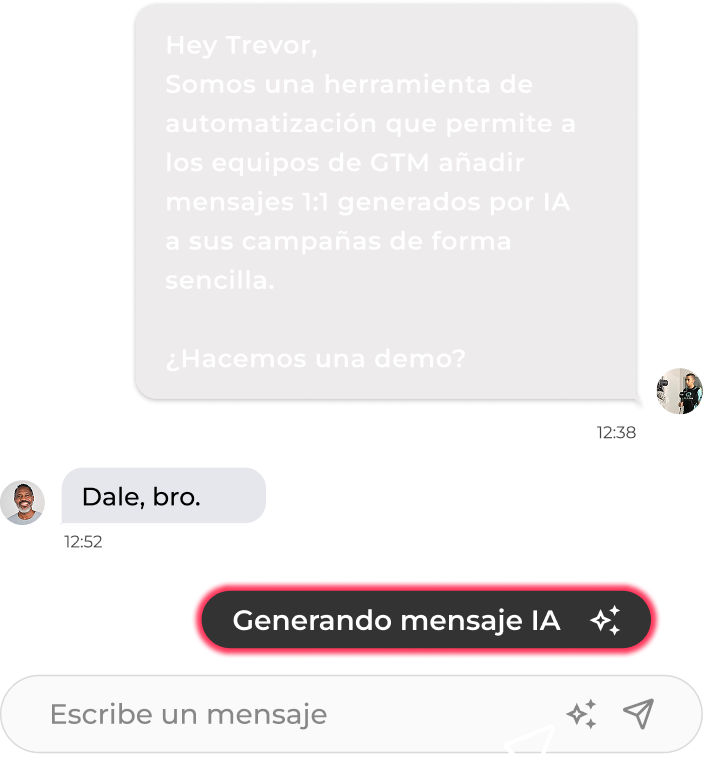 Tú le dices qué tipo de mensaje quieres mandar, nuestra IA hace el resto: analiza el perfil, visita la web, lee el contenido y hasta busca en Google para generar un mensaje único para cada persona.